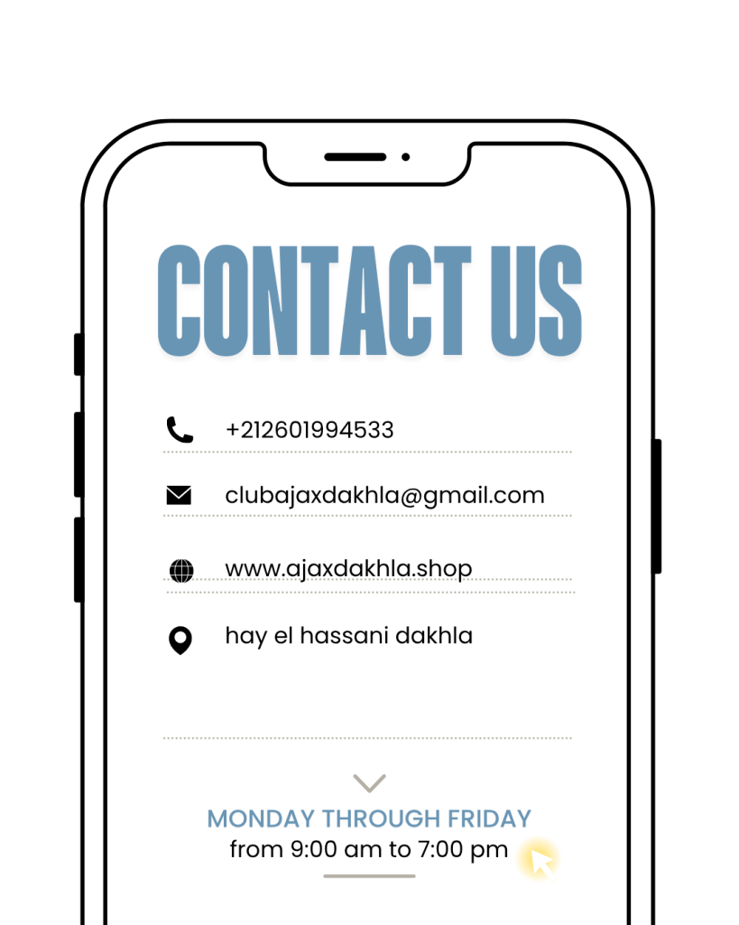يسعدنا في نادي أجاكس الداخلة استقبال جميع استفساراتكم واقتراحاتكم بخصوص أنشطتنا الرياضية وبرامجنا التدريبية. نحن نؤمن أن التواصل مع اللاعبين، وأولياء الأمور هو سرّ نجاحنا واستمرارنا في تطوير كرة القدم بالجهة.